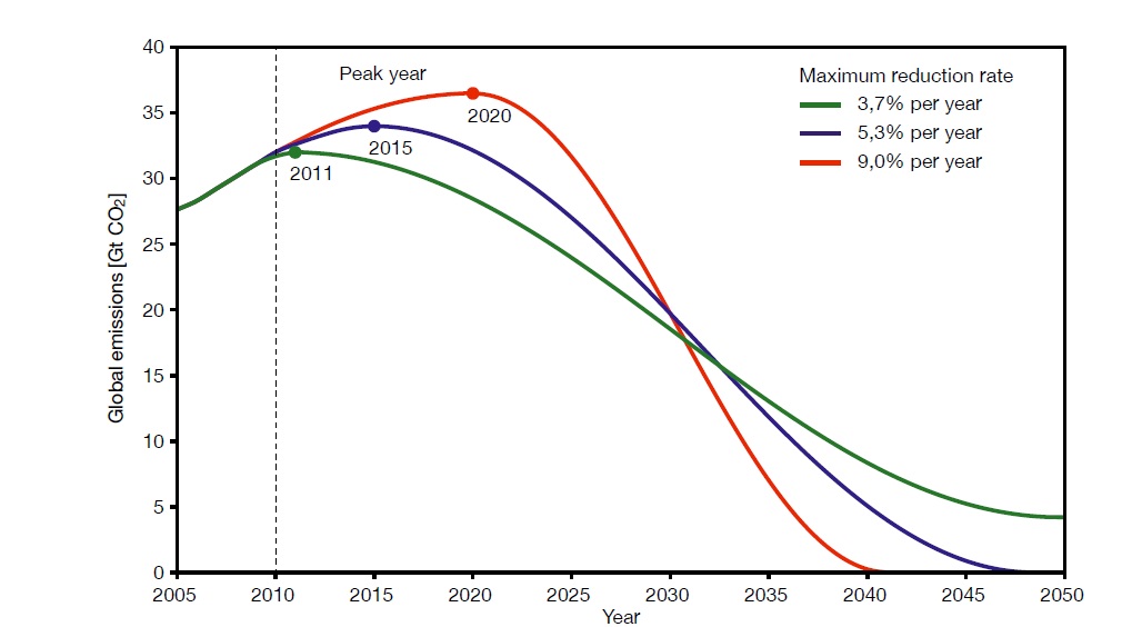 If we stay on the path that leaders agreed on in Durban, emissions will peak long after 2020 – in the best case scenario, they will only start slowing in 2020. If the triple black diamond looks steep, imagine a graph where emissions peak in 2030 or 2040 – it’s basically impossible to achieve our goal, no matter how high we tax carbon or how many wind turbines we build.