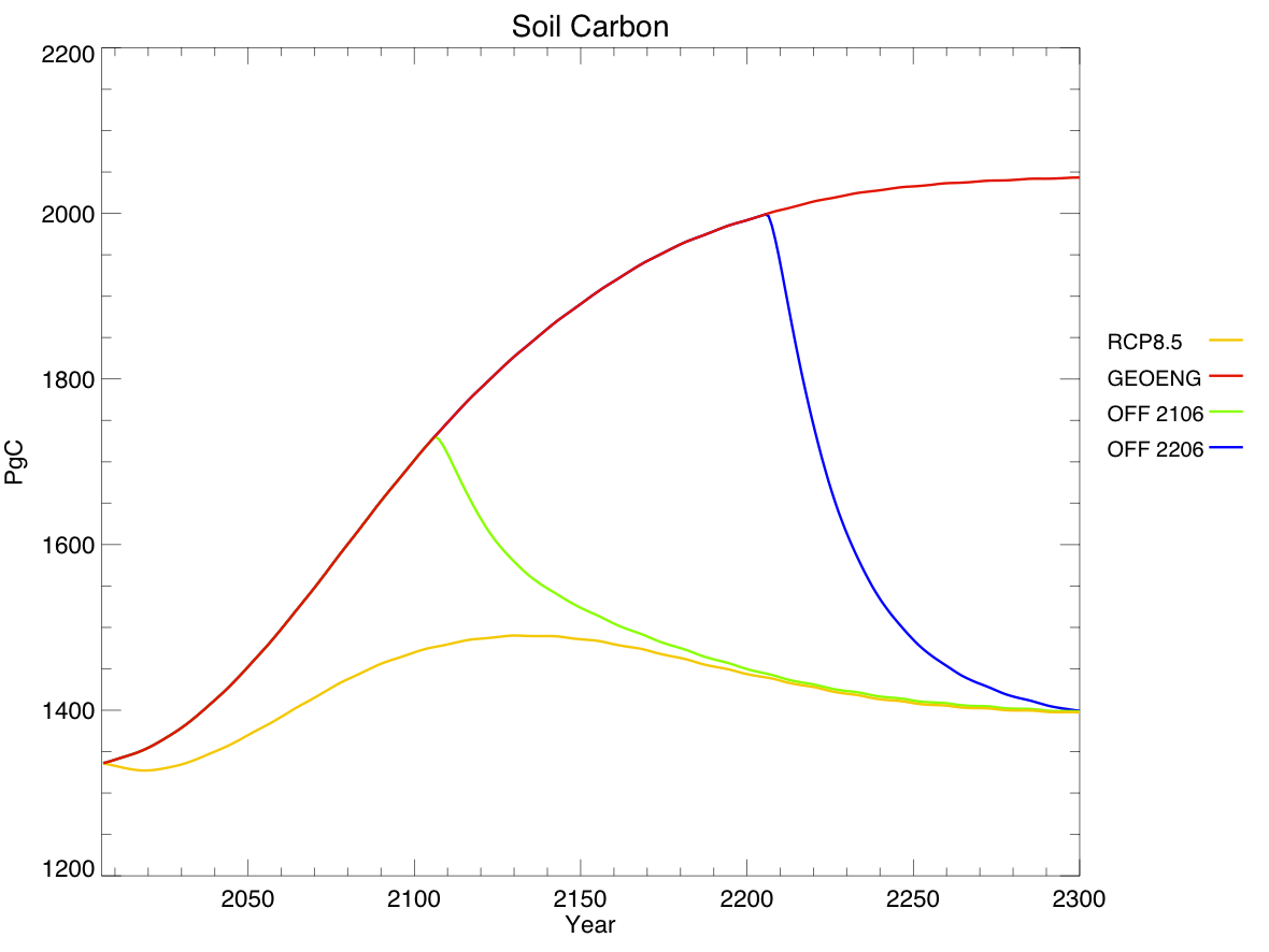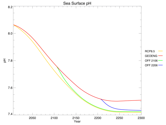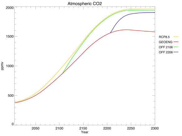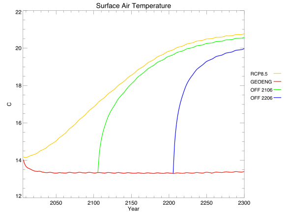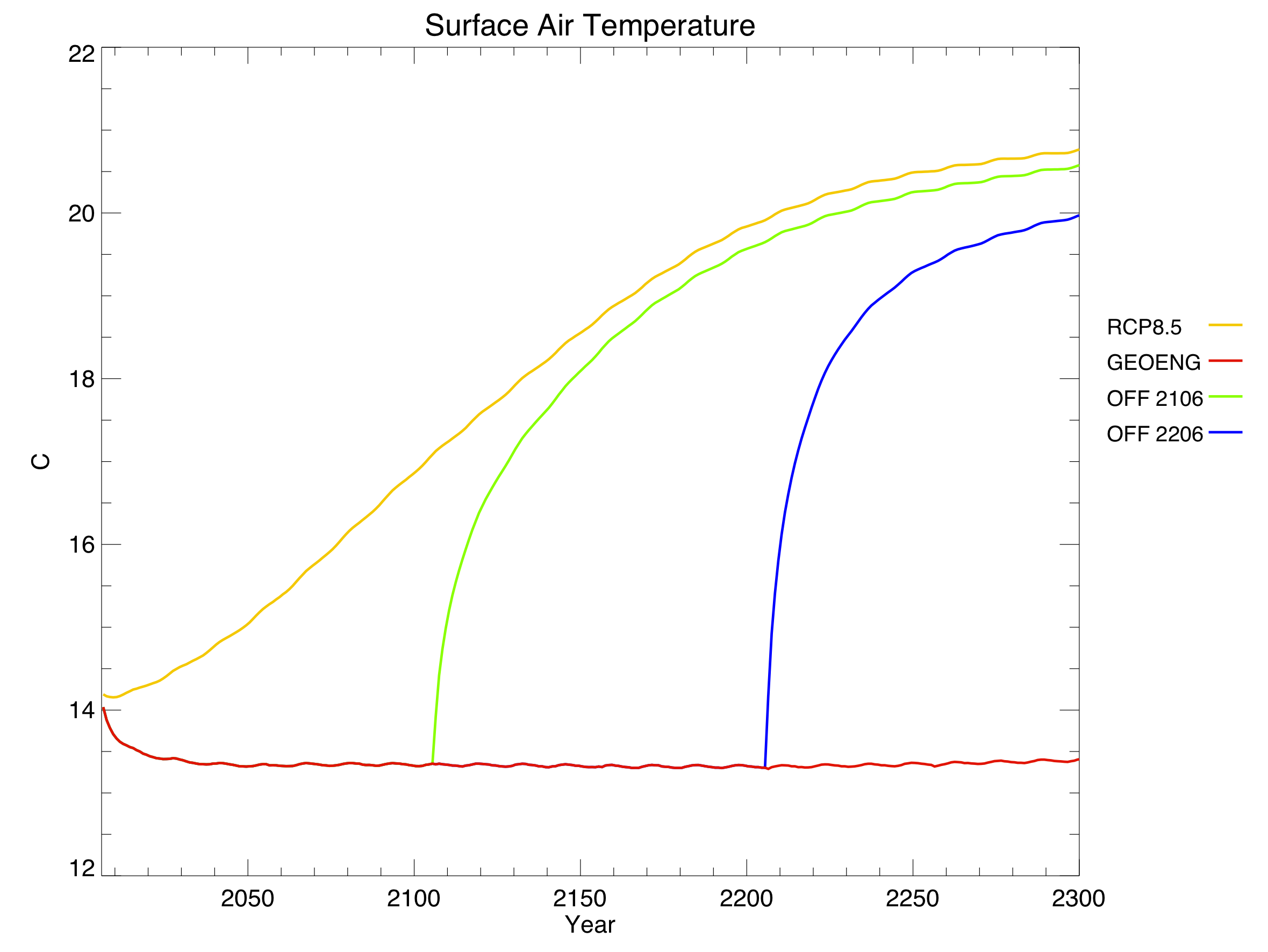 By this time, having completed several thousand years of model simulations, we realized that we were getting a bit carried away. But nobody else had models in the queue – again, they were all on vacation – so our simulations were running three times faster than normal. Using restart files (written every 100 years) as our starting point, we turned off geoengineering instantaneously for RCPs 6.0 and 8.5, after 100 years as well as 200 years.