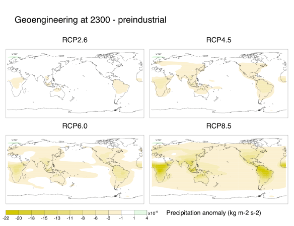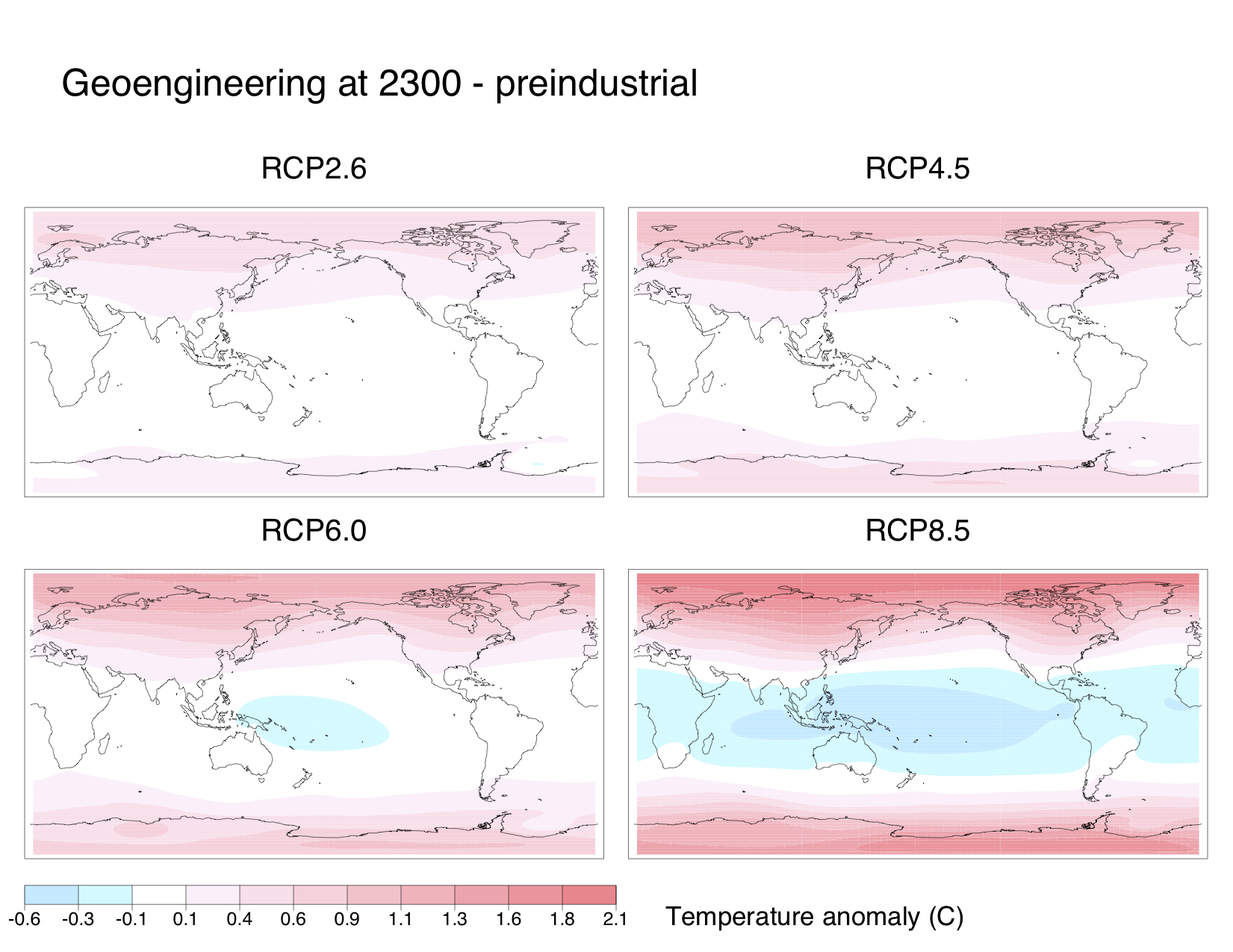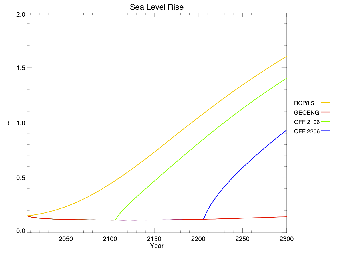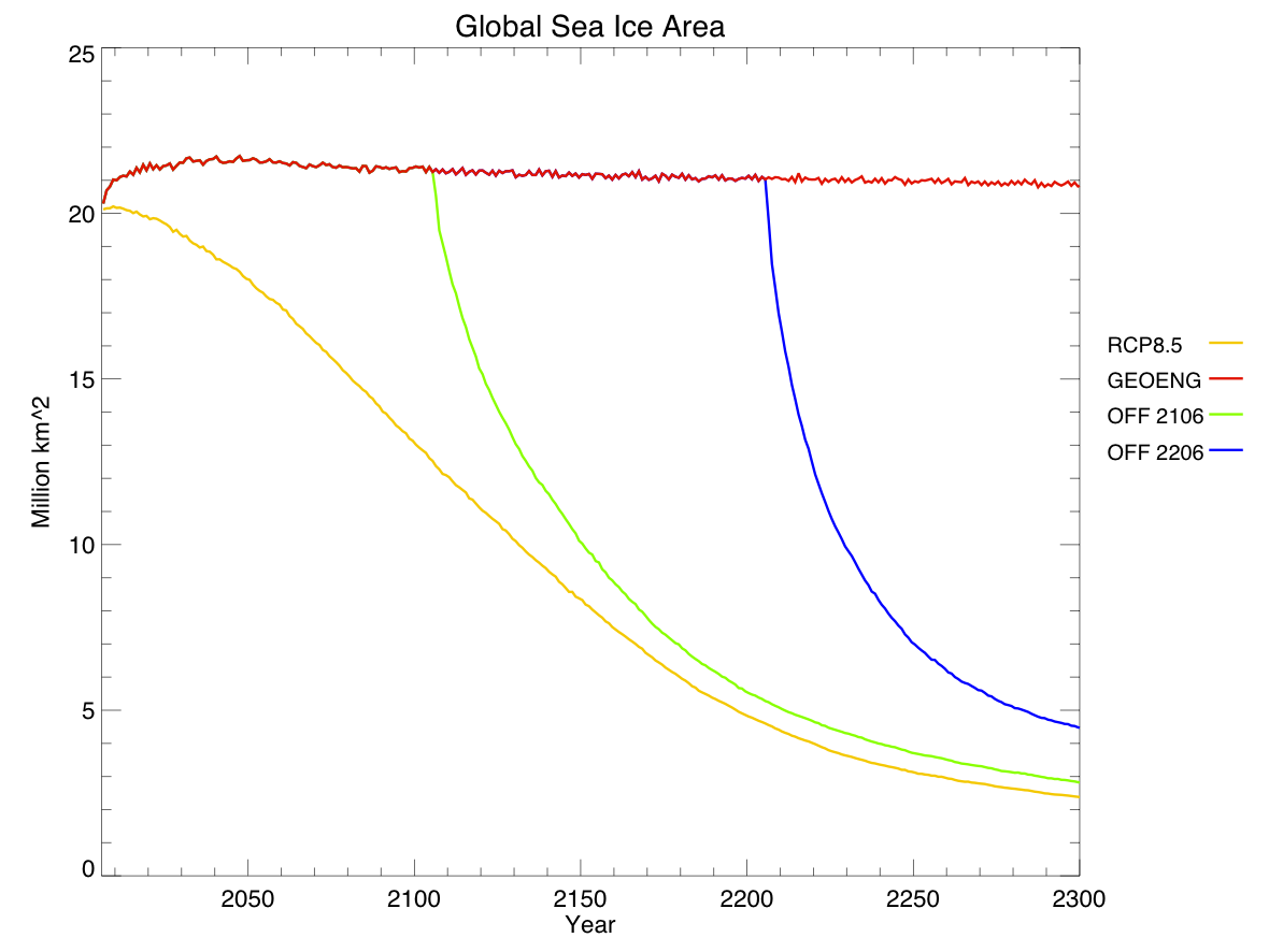 By this time, having completed several thousand years of model simulations, we realized that we were getting a bit carried away. But nobody else had models in the queue – again, they were all on vacation – so our simulations were running three times faster than normal. Using restart files (written every 100 years) as our starting point, we turned off geoengineering instantaneously for RCPs 6.0 and 8.5, after 100 years as well as 200 years.