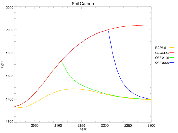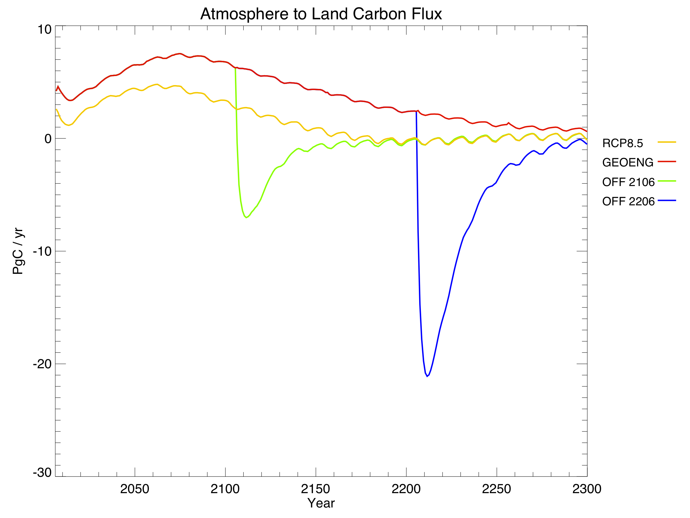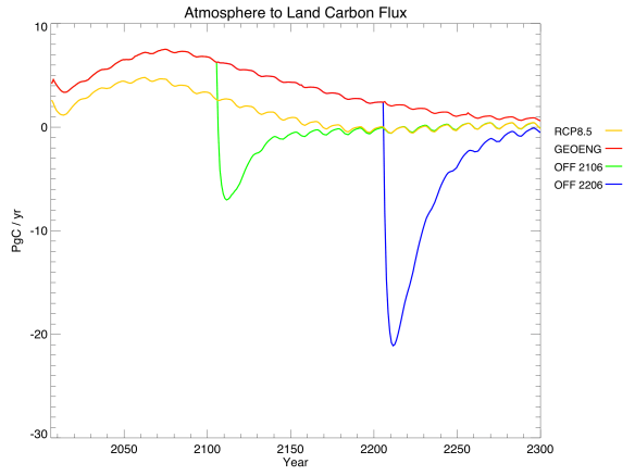 In this graph, positive values mean that the land is a net carbon sink (absorbing CO2), while negative values mean it is a net carbon source (releasing CO2). Note the large negative spikes when geoengineering is turned off: the land, adjusting to the sudden warming, spits out much of the carbon that it had previously absorbed.