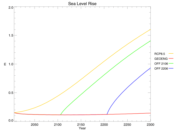 Sea level rise (due to thermal expansion only – the ice sheet component of the model isn’t yet fully implemented) is directly related to temperature, but changes extremely slowly. When geoengineering is turned off, the reversals in sea level trajectory look more like linear offsets from the regular RCP.