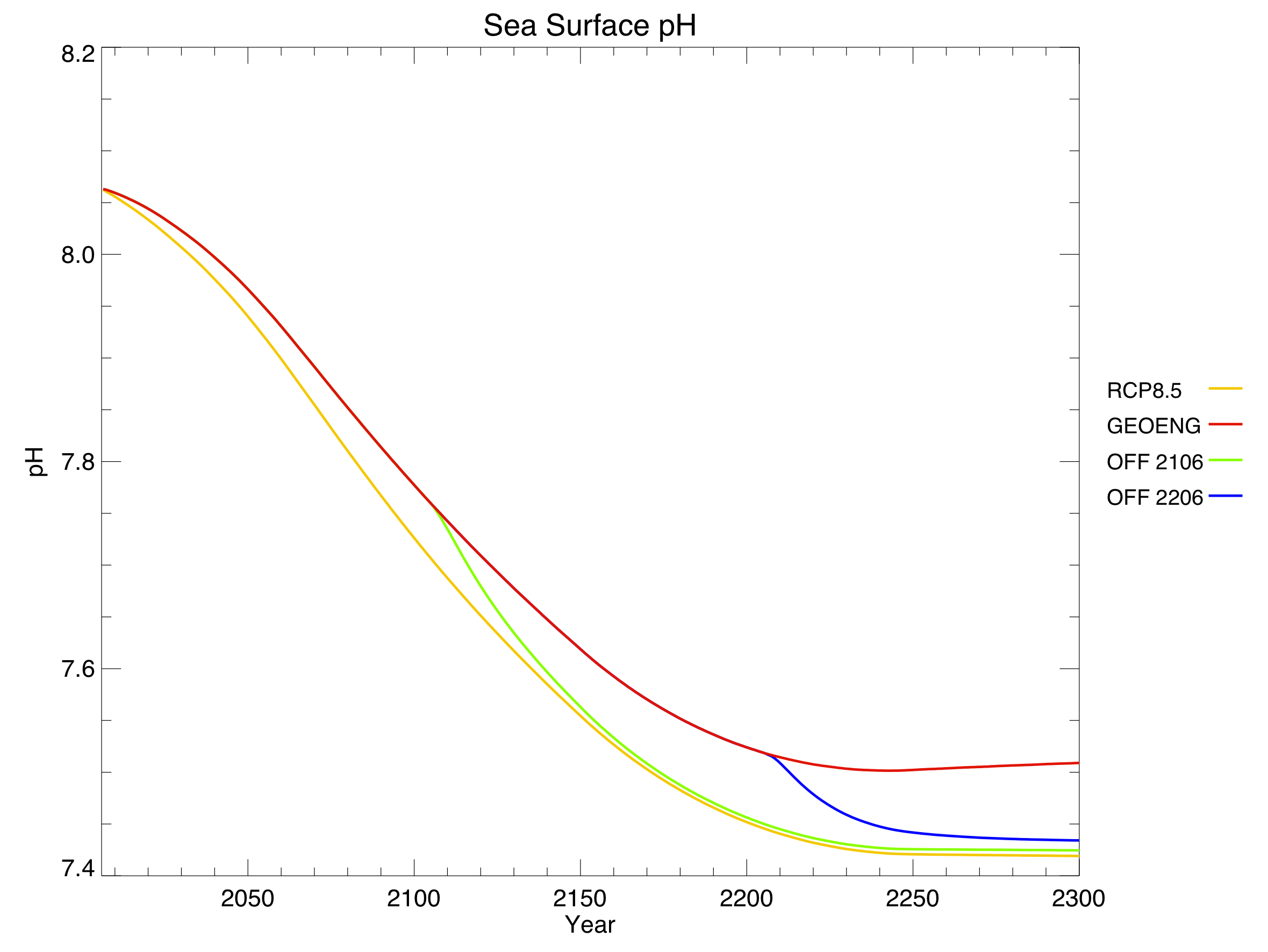 Finally, the lower atmospheric CO2 led to lower dissolved CO2 in the ocean, and alleviated ocean acidification very slightly. Again, this benefit quickly went away when geoengineering was turned off.