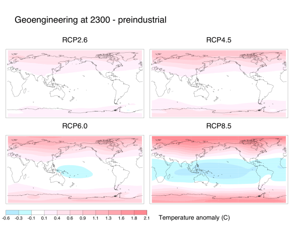 After a few failed attempts to represent geoengineering without editing the model code (e.g., altering the volcanic forcing input file), we realized it was unavoidable. Model development is always a bit of a headache, but it makes you feel like a superhero when everything falls into place. The job was fairly small – just a few lines that culminated in equation 1 from the original paper – but it still took several hours to puzzle through the necessary variable names and header files! Essentially, every timestep the model calculates the forcing from CO2 and reduces incoming solar radiation to offset that, taking changing planetary albedo into account. When we were confident that the code was working correctly, we ran all four RCPs from 2006-2300 with geoengineering turned on. The results were interesting (see below for further discussion) but we had one burning question: what would happen if geoengineering were suddenly turned off?