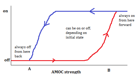 The current thinking in physical oceanography is that the AMOC is more or less binary – it’s either “on” or “off”. When AMOC strength is below a certain level (let’s call it A), its only stable state is “off”, and the strength will converge to zero as the currents shut down. When AMOC strength is above some other level (let’s call it B), its only stable state is “on”, and if you were to artificially shut it off, it would bounce right back up to its original level. However, when AMOC strength is between A and B, both conditions can be stable, so whether it’s on or off depends on where it started. This phenomenon is known as hysteresis, and is found in many systems in nature.