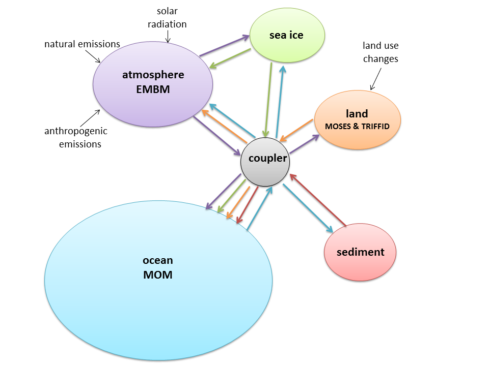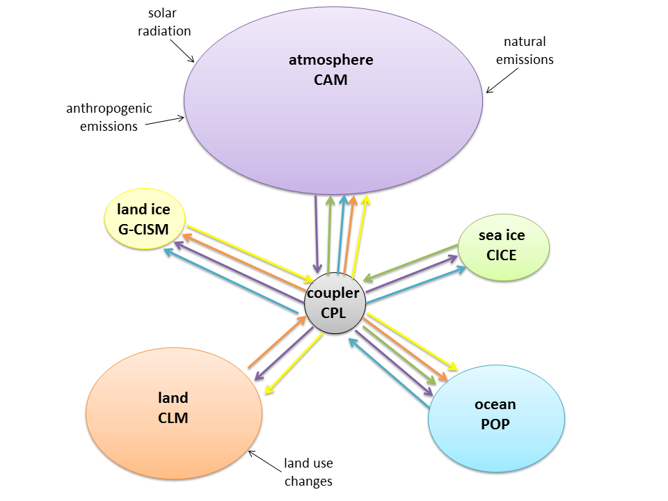 Each component is developed independently, and as a result, they are highly encapsulated (bundled separately in the source code). However, the real world is not encapsulated – the land and ocean and air are very interconnected. Some central code is necessary to tie everything together. This piece of code is called the coupler, and it has two main purposes: