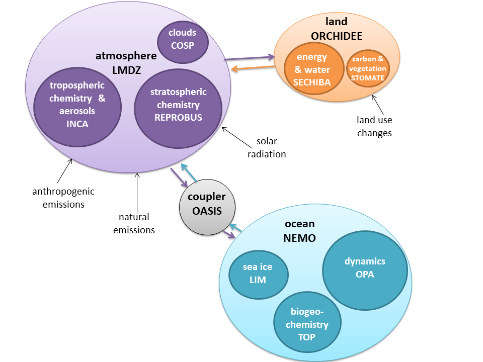 We can see that IPSL’s major components are atmosphere, land, and ocean (which also contains sea ice). The atmosphere is the most complex model, and land is the least. While both the atmosphere and the ocean use the coupler for data transfer, the land model does not – it’s simpler just to connect it directly to the atmosphere, since it uses the same grid, and doesn’t have to share much data with any other component. Land-ocean interactions are limited to surface runoff and coastal erosion, which are passed through the atmosphere in this model.