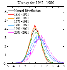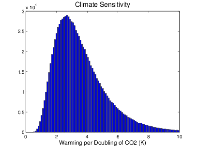 The IPCC AR4 report (note that AR5 was not yet published at the time of my calculations) compared many different probability distribution functions (PDFs) of climate sensitivity, shown below. They follow the same general shape of a shifted distribution with a long tail to the right, and average 5-95% confidence intervals of around 1.5 to 7 K per doubling of CO2.